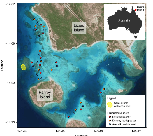 為期40天的實驗于2017年10月至2017年12月進(jìn)行,在這一年中,幼魚自然地遷移到了新的珊瑚礁中??茖W(xué)家將在安裝了功能揚聲器的受損珊瑚位置上進(jìn)行的觀察與在控制位置進(jìn)行的觀察進(jìn)行了比較,其中一些位置是裸露的,而另一些則是用假揚聲器操縱的。這樣做是為了測試海洋種群和多樣性的變化是否是由聲學(xué)處理本身引起的,還是由新?lián)P聲器系統(tǒng)帶來的增加的環(huán)境復(fù)雜性引起的。