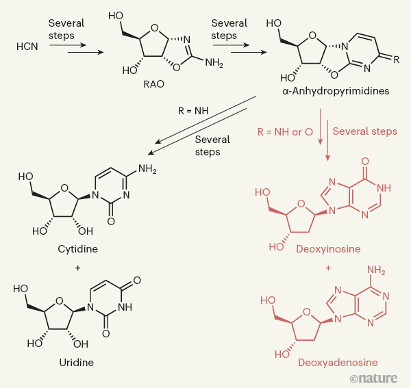 薩瑟蘭團隊將RNA核苷酸與新的DNA核苷酸結(jié)合在一起,獲得了全套4個核苷酸。他說,基于該核苷酸集合的雜交分子可能先于純RNA或DNA出現(xiàn)。